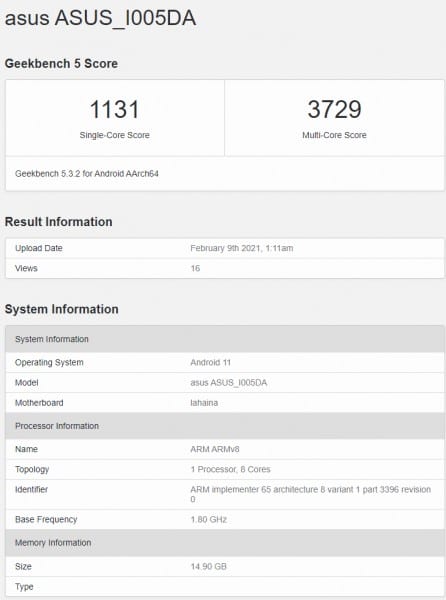 An Asus device with model designation I005DA and believed to be ROG Phone 5 was discovered last December at Geekbench with 8GB of RAM. The 16GB RAM variant is now displayed in the benchmark database, achieving 1,131 points and 3,729 points in single-core and multi-core tests, respectively. This is higher than the score of the 8GB RAM model.