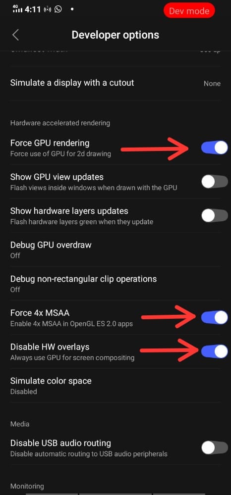 After that Enable Force GPU delivering, Force 4x MSAA, and Disable HW overlays.