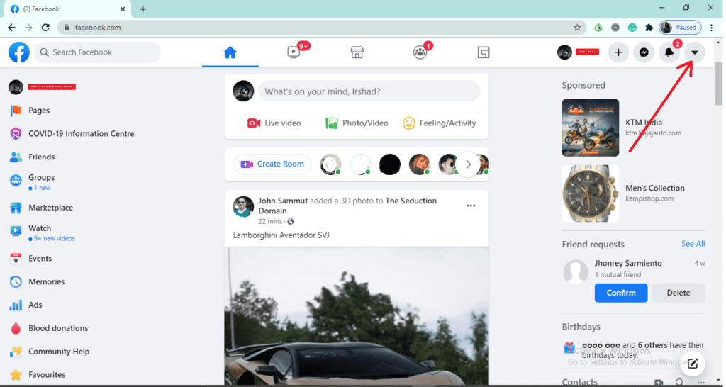 - Click the upside-down triangle in the upper right corner of any Facebook page.