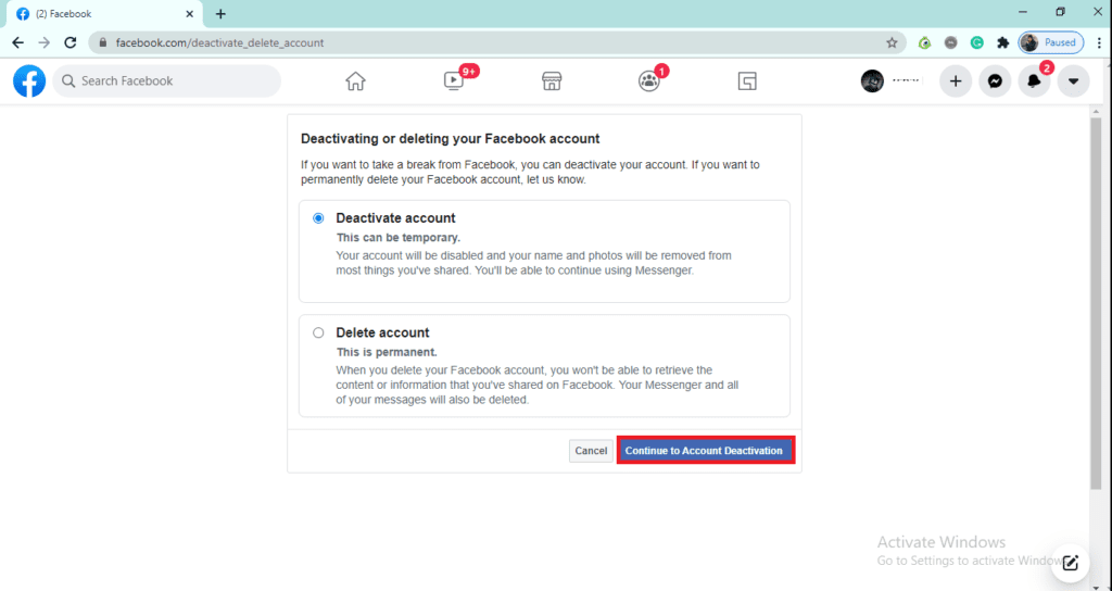 - Click on “Continue to Account Deletion or Deactivation Accordingly”