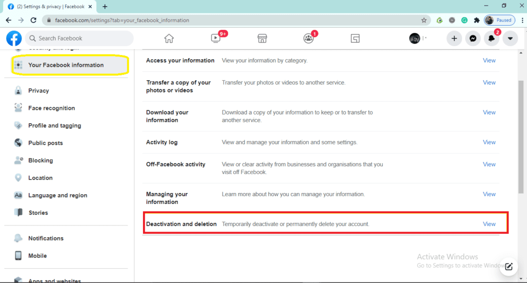 - Scroll down to the “Your Facebook Information” section and select ” Deactivation and Deletion”