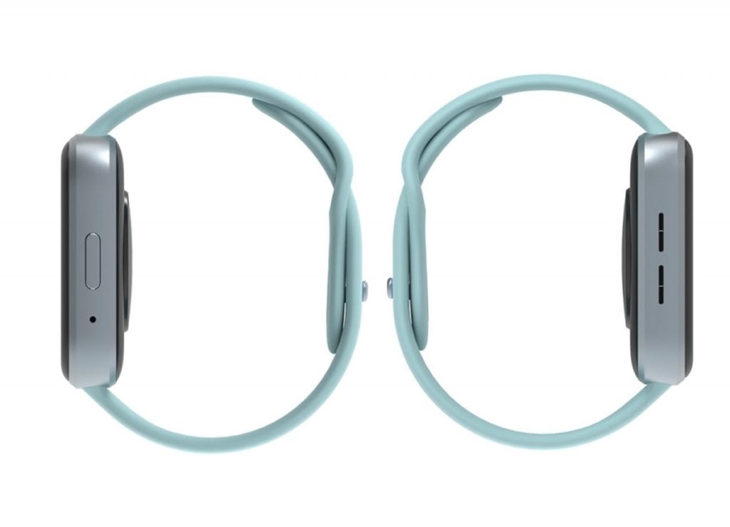 The device has a square screen and one button on the right. It’s very similar to the Apple Watch, especially with a rubber band with a very similar buckle.