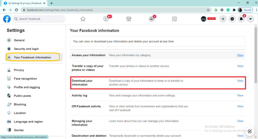 - Scroll down to the “Your Facebook Information” section and select ” Deactivation and Deletion”