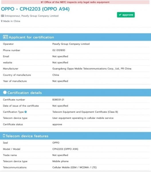 The model-designated CPH2203 Oppo device was certified by IMDA in Singapore about two weeks ago. This is now known to be Oppo A94 as the smartphone is NBTC certified.